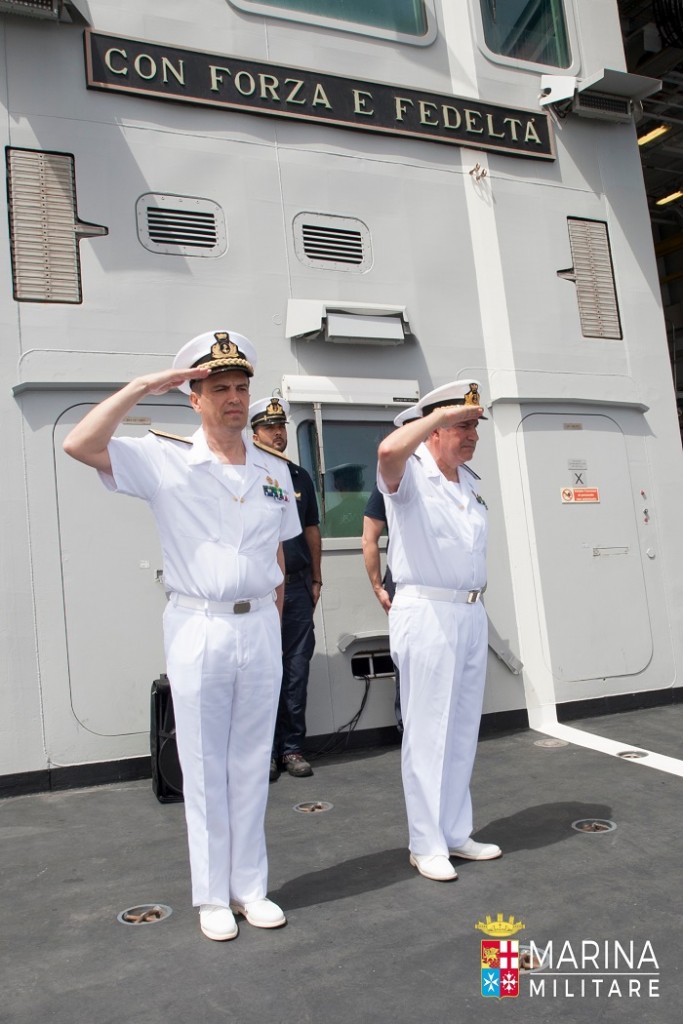 Augusta – A bordo della fregata Bergamini, ormeggiata presso la base navale di Augusta, il Comandante in Capo della Squadra Navale, ammiraglio di squadra Filippo Maria Foffi, ha presenziato all’assemblea di avvicendamento al comando dell’Operazione Mare Sicuro (O.M.S.) fra il contrammiraglio Salvatore Vitiello comandante la Terza Divisione Navale e il contrammiraglio Alberto Maffeis comandante le Forze da Pattugliamento per la Sorveglianza e la Difesa Costiera.