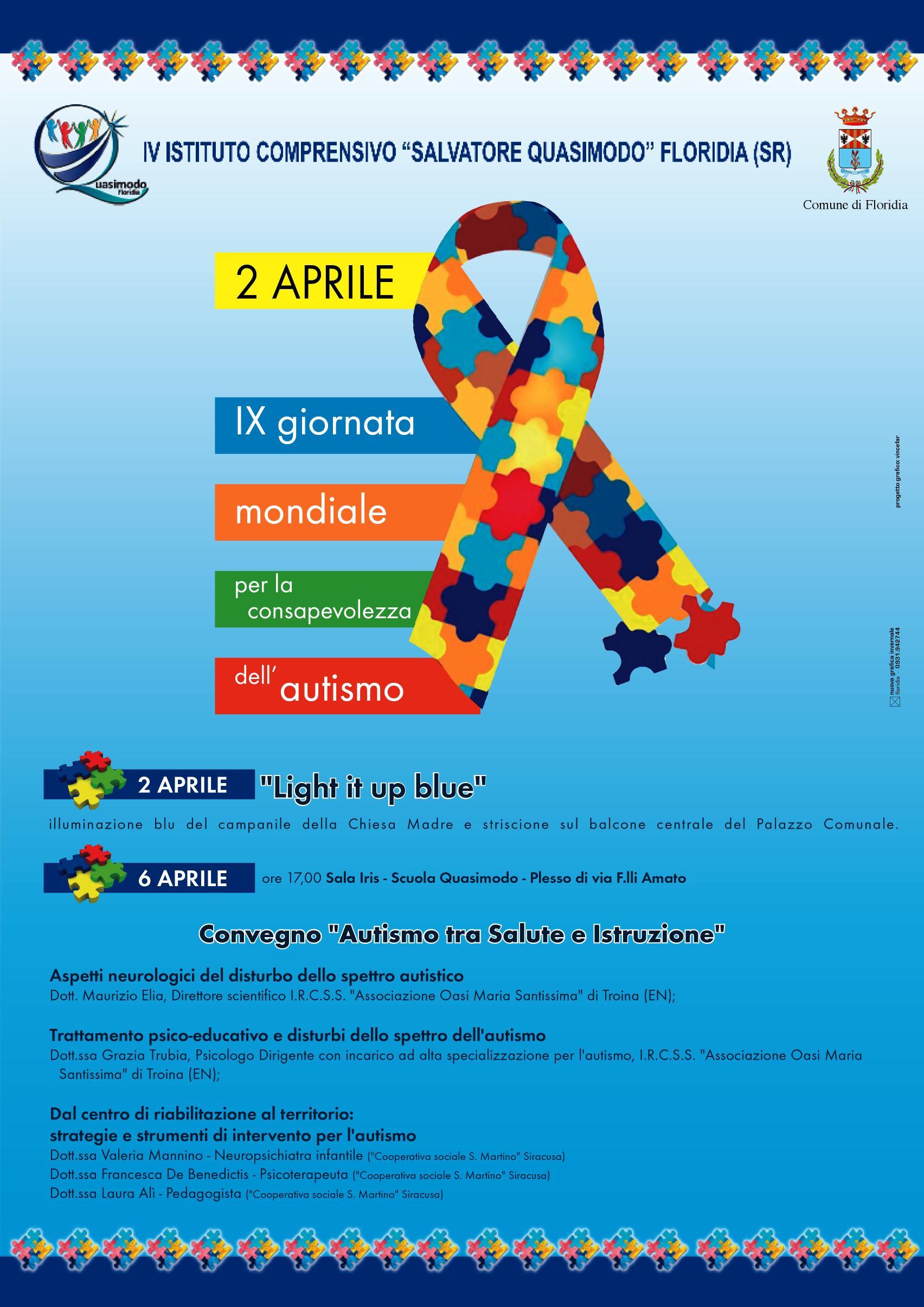 Sul tema AUTISMO TRA SALUTE E ISTRUZIONE si terrà un convegno in data 6 Aprile alle ore 17.00 presso la Sala IRIS di Floridia. Per maggiori informazioni si può consultare l’allegata locandina. In questi giorni nelle classi dell’Istituto si stanno svolgendo delle attività didattiche mirate all’inclusione degli alunni autistici presenti nella Scuola.