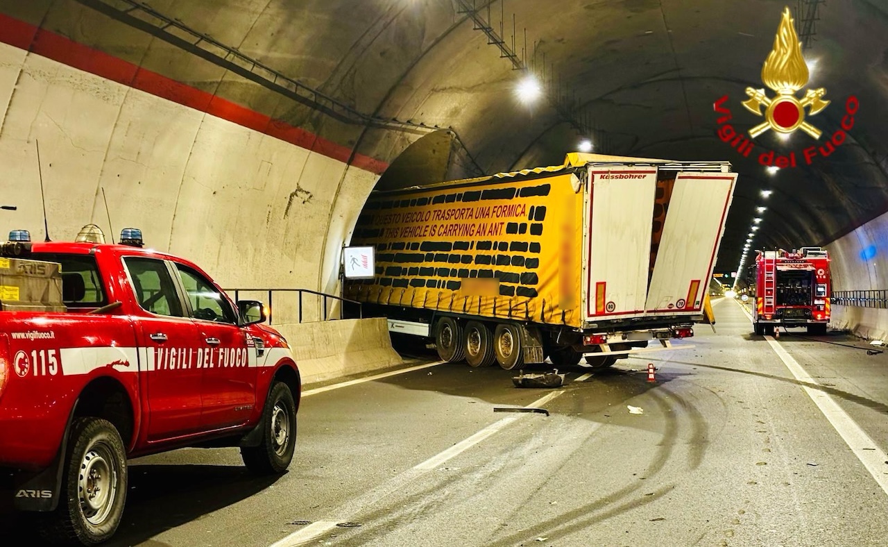 Il mezzo pesante, per una dinamica al vaglio delle forze dell’ordine, ha sbandato finendo per incastrarsi nell’uscita di emergenza.
