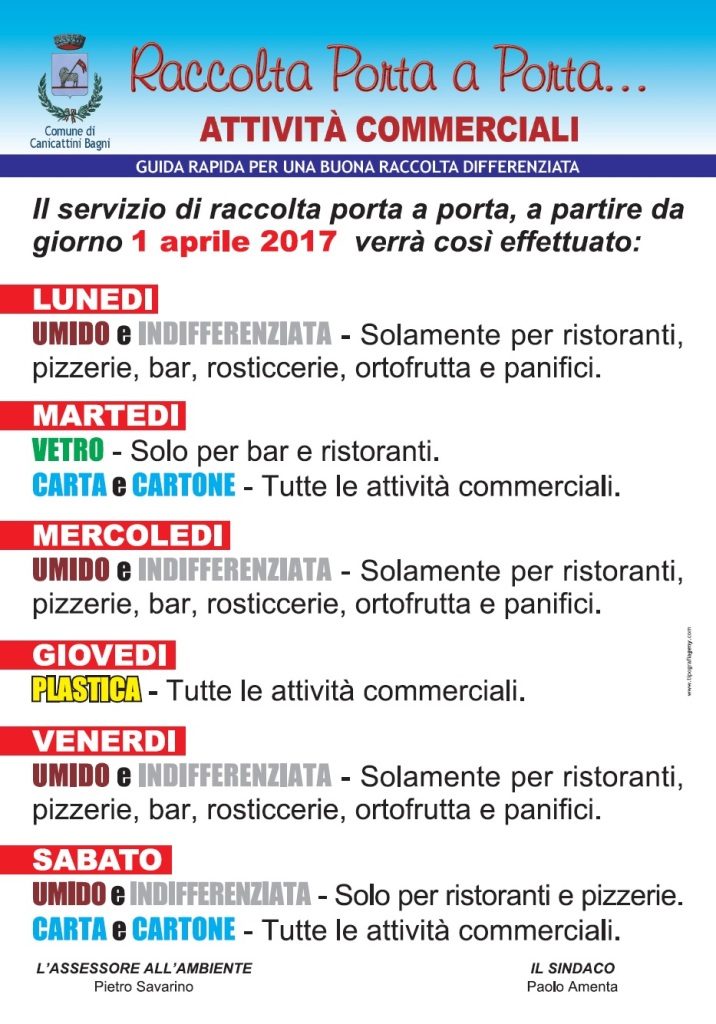 Lunedì: Umido e Indifferenziata, solamente per ristoranti, pizzerie, bar, rosticcerie, ortofrutta e panifici. Martedì: Vetro, solo per bar e ristoranti. Carta e Cartone, per tutte le attività commerciali. Mercoledì: Umido e Indifferenziata, solamente per ristoranti, pizzerie, bar rosticcerie, ortofrutta e panifici. Giovedì: Plastica, per tutte le attività commerciali. Venerdì: Umido e Indifferenziata, solamente per ristoranti, pizzerie, bar rosticcerie, ortofrutta e panifici. Sabato: Umido e Indifferenziata, solamente per ristoranti e pizzerie. Carta e Cartone, per tutte le attività commerciali.