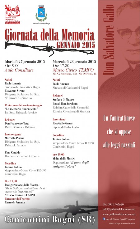 Nel settantesimo anniversario della chiusura dei campi di sterminio dove trovarono la morte milioni di deportati, si ricorda la figura di DON SALVATORE GALLO, sacerdote gesuita canicattinese che si oppose alle leggi razziali.