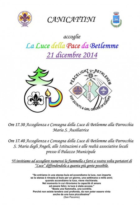 Domenica pomeriggio, 21 Dicembre alle 17:30, la fiammella della lampada che arde nella Chiesa della Natività a Betlemme, alimentata dall’olio donato a turno da tutte le Nazioni della Terra, sarà a Canicattini Bagni, portata da Siracusa dagli Scout per essere donata a tutta la comunità canicattinese.