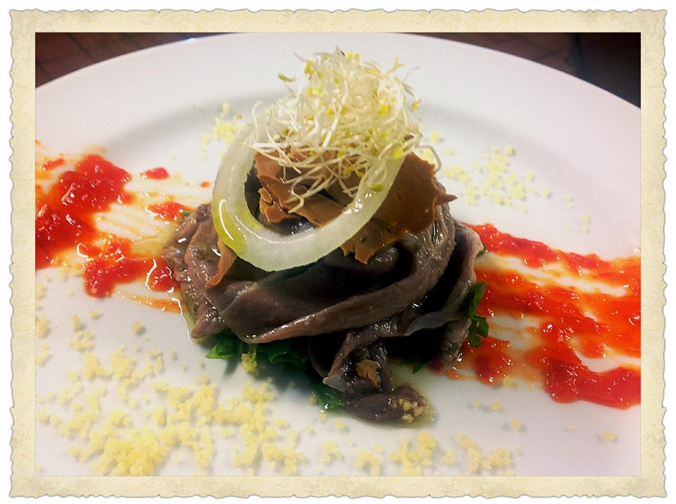 “CARPACCIO DI ASINO RAGUSANO SU RUCOLETTA, SCAGLIE DI RICOTTA INFORNATA STAGIONATA E CONFETTURA DI PEPERONI”