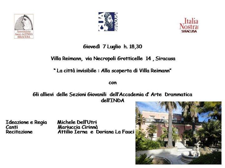 Siracusa – Avrà luogo domani alle ore 18.30 a villa Reimann lo spettacolo: “La città invisibile: alla scoperta di villa Reimann”, con gli allievi delle Sezioni giovanili dell’Accademia d’Arte Drammatica della Fondazione INDA.