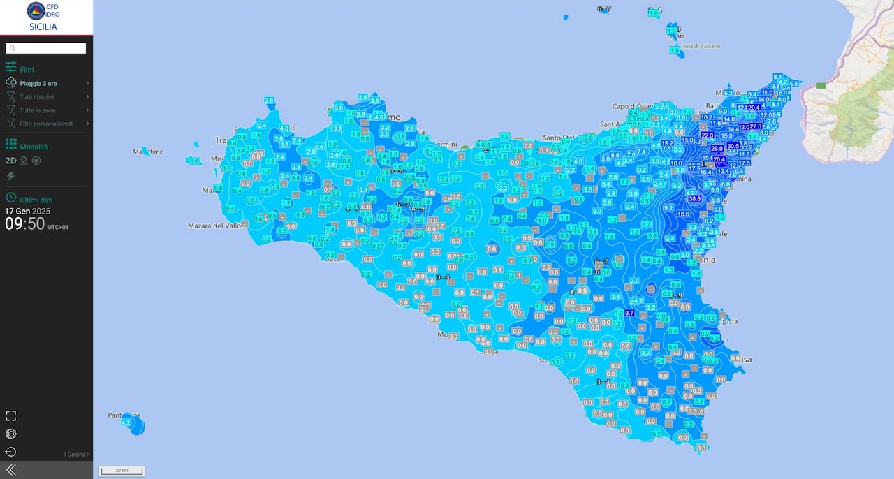 (Nell’immagine di copertina: mappa Aegis sulle precipitazioni piovose nelle prime ore della mattina divulgata dal dipartimento regionale di protezione civile)