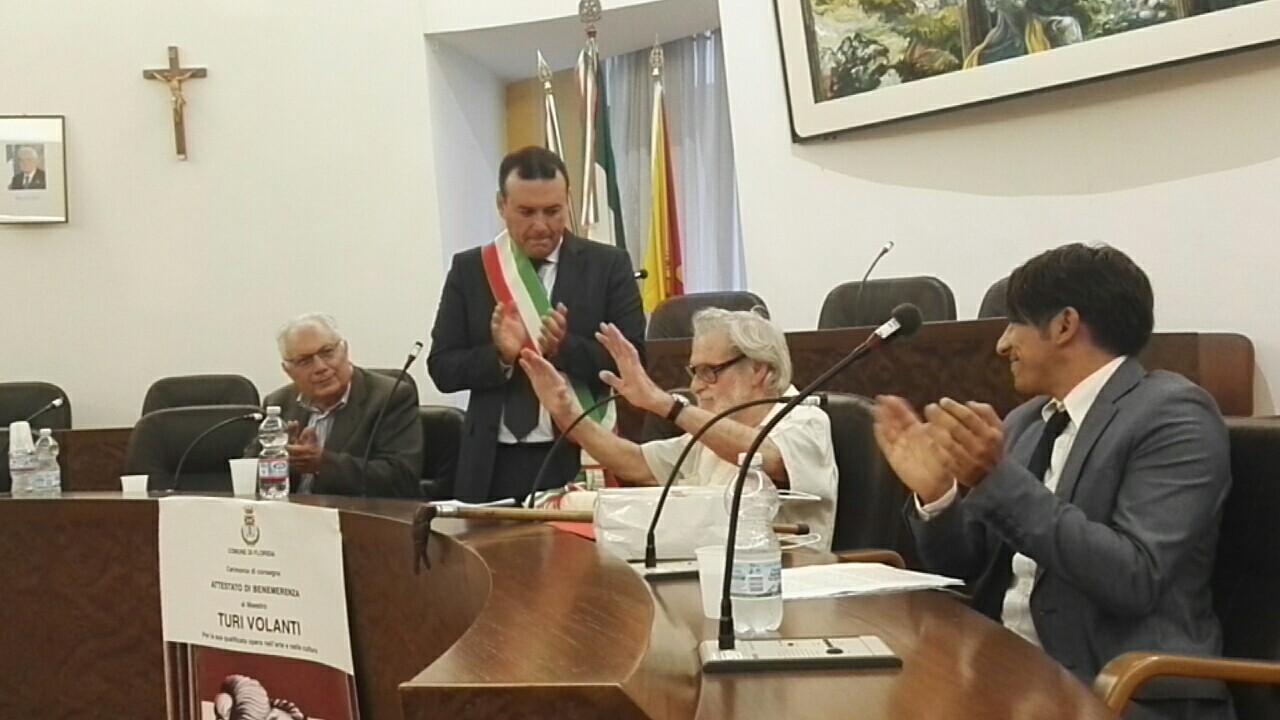 FLORIDIA – Un attestato di Benemerenza è stato consegnato al Maestro Turi Volanti, affermato artista floridiano, per i meriti conseguiti durante la sua lunga carriera, per la generosità, l’altruismo e l’incisiva attività artistica e culturale svolta nel corso degli anni. La cerimonia si è svolta alla presenza del primo cittadino di floridia Orazio Scalorino che ha consegnato l’attestato.
