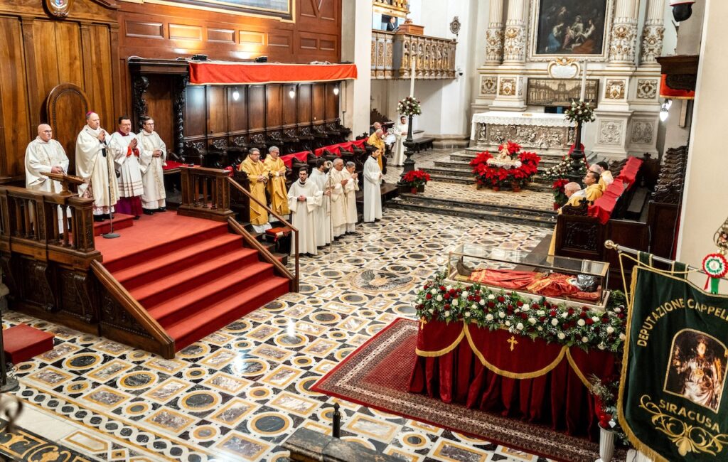 Stamani Siracusa ha salutato il Corpo di Santa Lucia con la messa celebrata in Cattedrale alle ore 8 prima della partenza per Carlentini, altra città di cui la santa è patrona, dov’è iniziata la peregrinatio nei centri siciliani. Venerdì 27 dicembre le sacre spoglie saranno a Belpasso e il giorno dopo ad Aci Catena. Domenica 29 l’arrivo a Catania, dove saranno esposte ai devoti nella cattedrale insieme con le spoglie di Sant’Agata. Mercoledì 30 dicembre la ripartenza per Venezia.