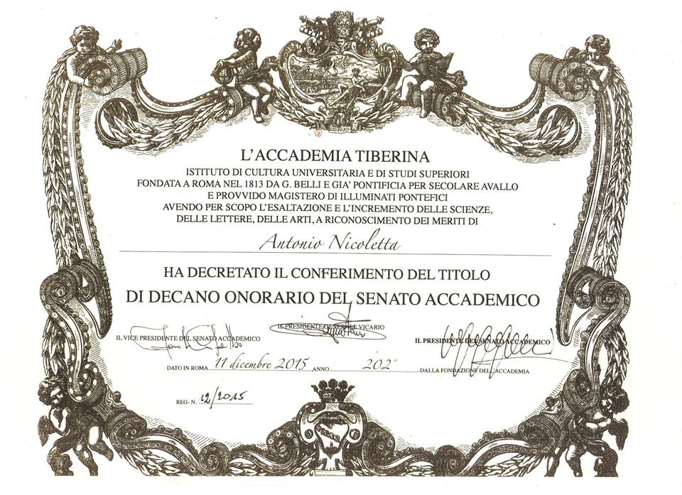 Velletri – Un alto riconoscimento è stato consegnato al Cav. Antonio Nicoletta da parte dell’Accademia dei Tiberini. Il Cav. Nicoletta è stato nominato Decano Onorario del Senato Accademico. L’attestato gli è stato consegnato in una cerimonia ufficiale nei giorni scorsi. Antonio Nicoletta prima di lasciare Floridia per trasferirsi a Velletri a Floridia ha fondato il Kiwanis, la Misericordia, ha partecipato attivamente nel cambiamento dello stemma e dono del gonfalone. Ha riscoperto la figura di Pinnone e grazie a lui e al Kiwanis che fu collocata una lapide all’entrata del Comune di Floridia. Iscritto all’albo dei giornalisti collabora con vari giornali locali. Ha pubblicato anche il libro “e furono detti briganti”, “ero bambino nel 47”, “pomeriggio d’estate (poesie pluripremiate. Giurato in vari concorsi di poesia. Antonio Nicoletta fa parte dell’Accademia dal 2001.
