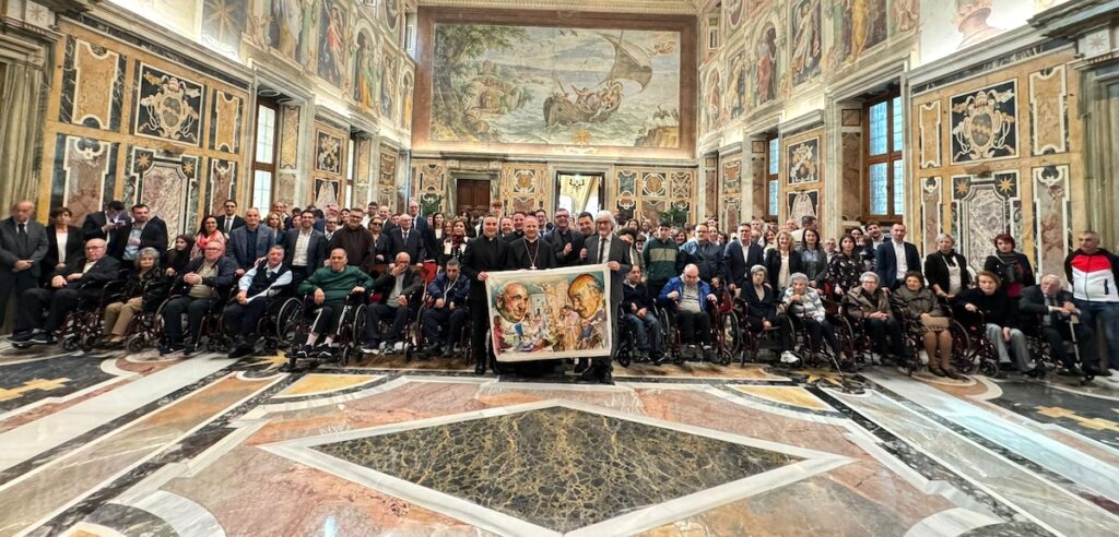 L’arcivescovo di Siracusa, monsignor Francesco Lomanto, e il presidente della Fondazione Sant’Angela Merici, don Alfio Li Noce, hanno guidato all’udienza straordinaria il gruppo formato da 170 persone in rappresentanza dei vari centri gestiti dalla Fondazione: i centri di riabilitazione a Siracusa e Canicattini Bagni; le case di riposo “Mons. Gozzo” e “San Giuseppe”; la casa alloggio “Madonna delle Lacrime” per le persone sieropositive; il centro di prima accoglienza “Villa Mater Dei” per le famiglie di immigrati, donne vittime di tratta e altri casi fragili e vulnerabili.
