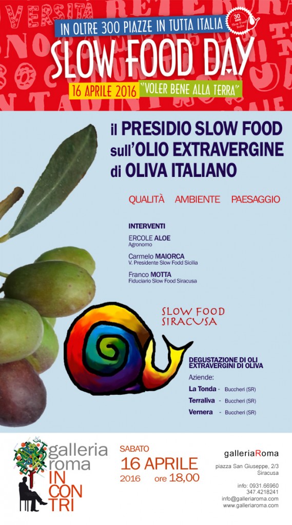 A Siracusa l’appuntamento principale è fissato sabato 16 aprile alle ore 18 nei locali della Galleria Roma di piazza San Giuseppe 2, dove si parlerà del “Presidio sull’olio extravergine di oliva”: un progetto nazionale avviato da Slow Food per tutelare l’olivicoltura veramente di qualità e rispettosa dell’ambiente che, pur tra difficoltà, continua a costituire uno dei caratteri distintivi del paesaggio agrario italiano.