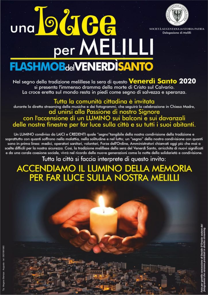 “Abbiamo voluto condividere questo messaggio con i soci di Augusta – dice Ragusa – estendendolo alla nostra comunità cittadina che, la sera del venerdì Santo, quando si svolge la processione di “Cristu mortu e a Madonna Addulurata”, è da sempre legata ai riti liturgici che si tengono nelle chiese del paese. Per tentare di colmare un vuoto nel sentire comune della collettività – spiega il delegato di Melilli – al termine della celebrazione della Passione nella chiesa Madre, sarà trasmessa una diretta streaming con la proiezione dei fotogrammi di Davide D’Orazio e l’ascolto delle musiche di Luigi Zimmitti. Un momento al quale abbiamo voluto accostare l’idea del lumino sui balconi e sui davanzali per accendere anche tra i cittadini melillesi sentimenti di condivisione e speranza. Ringrazio quanti hanno collaborato e permesso la realizzazione di questa importante iniziativa, a partire dal fotografo Davide D’Orazio, che ha aderito con entusiasmo. Sono grato anche al nostro presidente Giuseppe Carrabino, che ha accolto con entusiasmo la proposta di estendere a Melilli l’iniziativa che ha già trovato grande riscontro ad Augusta”.