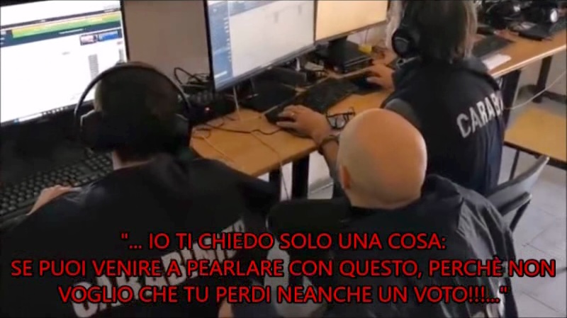 I reati ipotizzati vanno dalle estorsioni alla detenzione di armi e stupefacenti, all’introduzione in carcere di dispositivi telefonici, e viene contestato anche un episodio di presunto scambio elettorale politico-mafioso (vedi foto di copertina, fornita dai carabinieri, con trascrizione di stralcio di intercettazione telefonica).