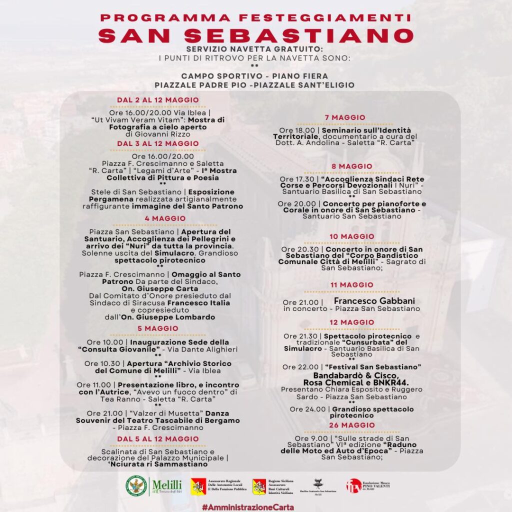 Il sindaco nonché deputato regionale Carta sottolinea gli eventi di punta: “Un’organizzazione, appunto, fatta anche di intrattenimento e micro eventi all’interno di un programma ampio come l’attesa performance del cantante Francesco Gabbani, in concerto sabato 11 maggio in piazza San Sebastiano, e il “Festival di San Sebastiano” giunto alla quarta edizione, che il 12 maggio ospiterà artisti del calibro di Bandabardò & Cisco, Rosa Chemical e i BNKR44. Il tutto arricchito da mostre fotografiche a cielo aperto e collettivi di pittura e poesia come “Ut vivam veram vitam” in via Iblea o “Legami d’arte” in saletta “R. Carta”, al concerto del Corpo bandistico comunale, sino all’esposizione della “‘Nciurata ri Sammastiano”. Eventi, quelli elencati, che permetteranno una permanenza più piacevole nella Terrazza degli Iblei”.