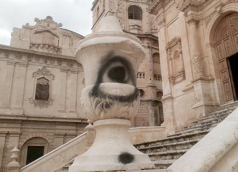 La chiesa di S. Francesco d’Assisi all’Immacolata, che si trova nel cuore di Noto, è stata visibilmente deturpata da ignoti per i quali la stessa connotazione di vandali risulta edulcorata. Non è mai passato inosservato il valore storico e artistico del monumento, che fu costruito tra il 1704 e il 1745 su progetto degli architetti Vincenzo Sinatra e Rosario Gagliardi. Imponente, con le sue tre rampe di scale, appartiene al Patrimonio dell’Unesco e rappresenta una delle tappe fondamentali per i turisti che vogliono conoscere Noto.