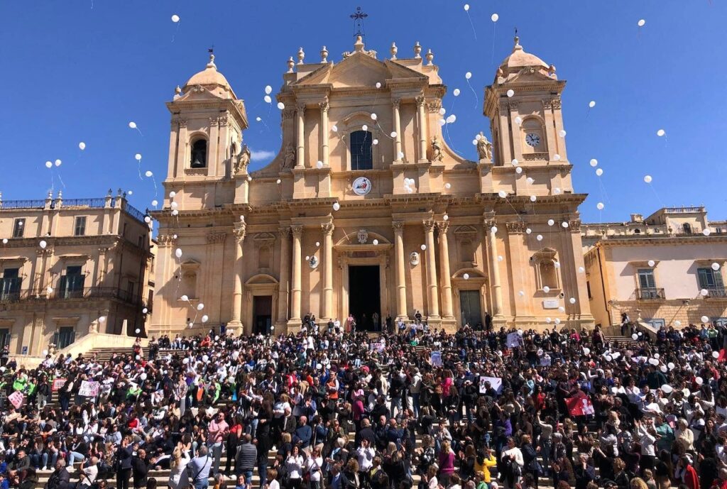 NOTO – Una marcia silenziosa con alcune migliaia di partecipanti, dalla villa comunale alla scalinata della Cattedrale, conclusa con il lancio di palloncini bianchi per ribadire il “no” alla violenza di genere nel nome di Sara Campanella, la ventiduenne universitaria originaria di Misilmeri (Palermo) uccisa il 31 marzo scorso a Messina.