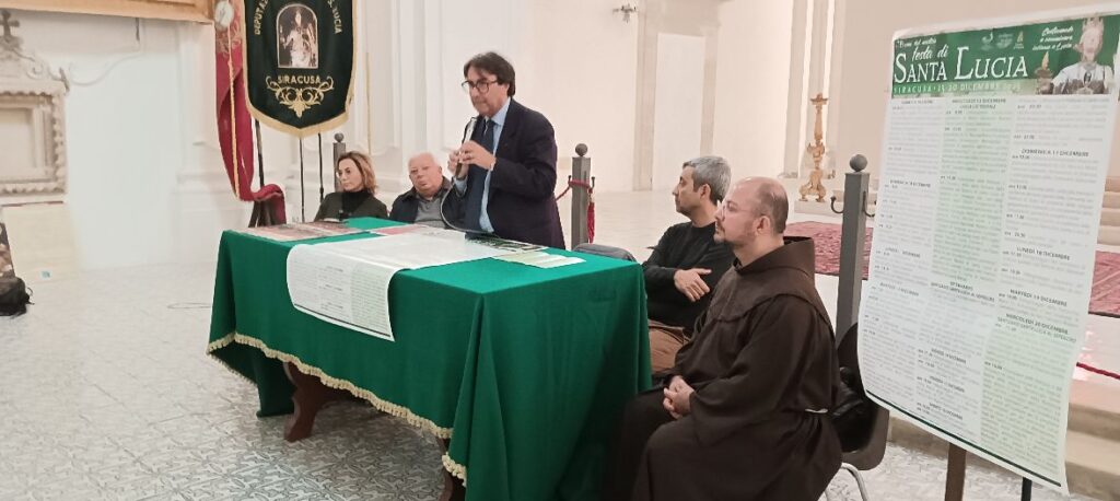 SIRACUSA – È tutto pronto per la festa di Santa Lucia a Siracusa, il cui programma è stato presentato questa mattina durante una conferenza stampa che si è tenuta nella chiesa della Badia in piazza Duomo. A coordinarla il presidente della deputazione Pucci Piccione, insieme con il parroco della cattedrale, padre Salvatore Marino e con quello del santuario di Santa Lucia al sepolcro fra’ Daniele Cugnata. Presenti anche Salvatore Sparatore e Elena Artale, membri della deputazione.