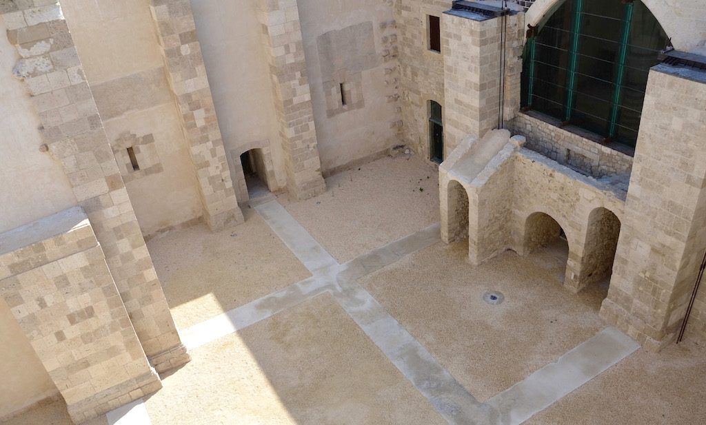 La corte interna al castello, riedificata nel periodo spagnolo a seguito dell’esplosione del 1704 (che provocò la distruzione di 15 delle 25 campate che facevano parte dell’originaria sala ipostila), era già stata oggetto di interventi di restauro nel 2017. Grazie ai più recenti lavori completati nei giorni scorsi, è stata mantenuta la geometria preesistente con interventi sulle fasce che sono state realizzate nella stessa pietra calcarea che ricopre il pavimento della sala e rivestimento dello spazio interno con il cocciopesto, inoltre all’intersezione delle fasce, sono state disegnate, in pianta, la forma e le dimensioni delle basi e delle colonne preesistenti.