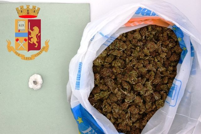A seguito della perquisizione del mezzo, gli agenti hanno rinvenuto, all’interno di alcuni zaini e marsupi, una busta con circa 400 grammi di marijuana, un involucro contenente circa 6 grammi di cocaina, un flacone di metadone e 910 euro, probabile provento di spaccio.