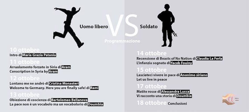 Pubblichiamo qui di seguito il manifesto esplicativo della campagna, dal titolo “Un manifesto contro l’arruolamento obbligatorio – Uomo libero vs Soldato“.