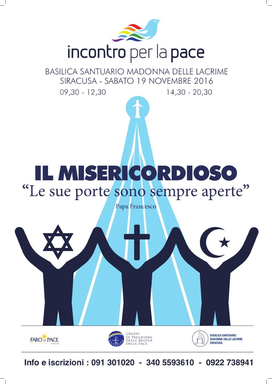SIRACUSA – Promuovere i valori della pace, della tolleranza, della riconciliazione del dialogo tra le religioni e i popoli. È uno degli obiettivi dell’incontro per la pace che avrà luogo sabato 19 novembre nella Basilica Santuario della Madonna delle lacrime a Siracusa. L’incontro, giunto alla sua 18ª edizione, ha come titolo “Il Misericordioso“. Tra i protagonisti i rappresentanti delle tre religioni monoteiste che spiegheranno cosa significa misericordia per il loro Dio.