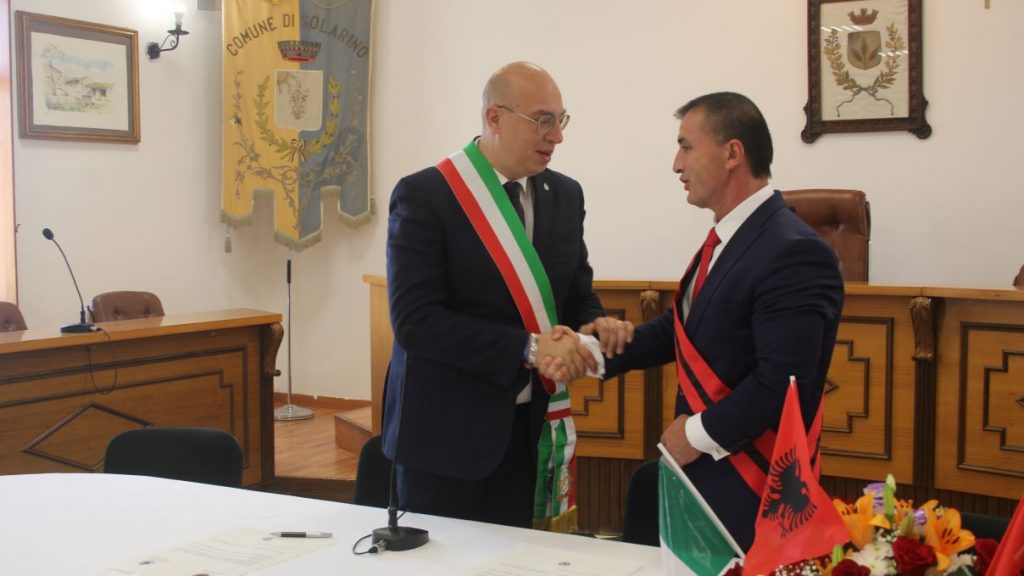 Durante il secondo momento, quello più istituzionale, i due sindaci hanno firmato un documento che riconosce il gemellaggio (nato il 28 novembre scorso dalla visita della delegazione solarinese in Albania) tra le due comunità. “In nome dell’amicizia che lega i due paesi – si legge – oggi 16 giugno 2023, la storia ha voluto che una delegazione composta dai massimi esponenti della cittadina di Tepelenë sia giunta in visita istituzionale in quel di Solarino per affondare le basi di un proficuo gemellaggio. La cosa ha suscitato unanime plauso e gratitudine nell’Amministrazione comunale e nell’intera città. Nel presente riconoscimento, nella qualità di graditi testimoni, appongono le firme i rispettivi sindaci”. Poi si è proceduto allo scambio di doni tra gli applausi dei presenti.